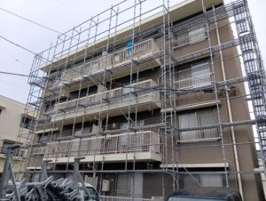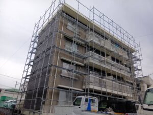 葵区千代田アパート 外壁塗装工事に先立って行った仮設工事の様子をご紹介します。
