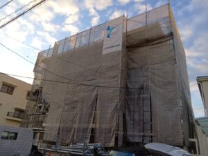塗装工事を安全かつスムーズに進めるため、まずは建物全体を囲うように足場を設置しました。