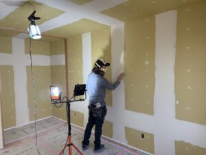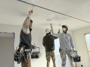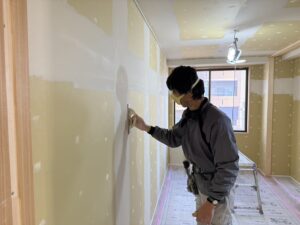 天井・壁の石膏ボードは、継ぎ目やビス穴をパテのよるジョイント処理を行いました。