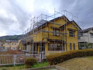 建物全体をしっかりと覆うように組み上げ、勾配のある屋根の上でも安定して作業ができるよう、