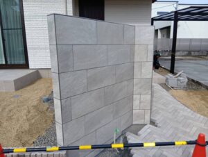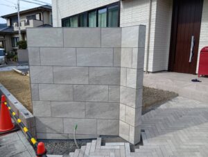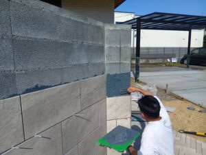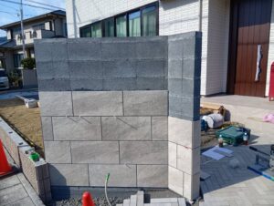 ブロック塀に下地処理を施し、タイルを一枚一枚丁寧に施工しています。