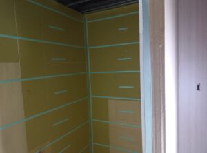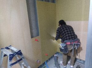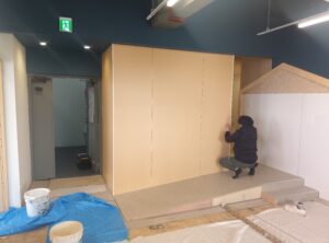 LGS工事で組み上げた下地に対して石膏ボード貼りを行いました。